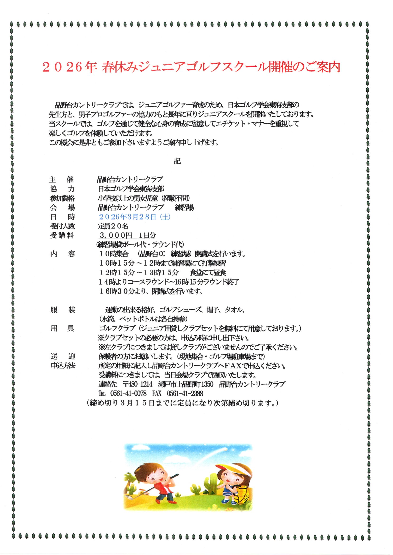 2026年春休みジュニアスクールを下記内容で開催する事となりました。当日は日本ゴルフ学会東海支部の先生方と男子プロゴルファーから親切、丁寧に指導して頂けます。このジュニアスクールでは技術だけではなく、ルール、マナーに重点を置きジュニアゴルファーの育成を行っております。 この機会に品野台カントリークラブ、ジュニアスクールをお子様に体験させてあげて下さい。