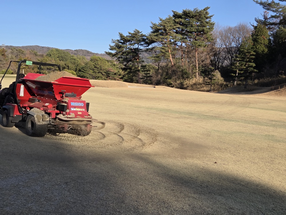 FW目砂散布作業を実施しております。バーチカルカットでサッチ(芝の老廃物)を取り除いたあと隙間に砂を入れて行きます。細かく残ったサッチ層と混ぜ合う事で土壌環境整えてまいります。ご来場のお客様にはご迷惑をお掛けいたしますが、ご理解と協力の程よろしくお願いいたします。